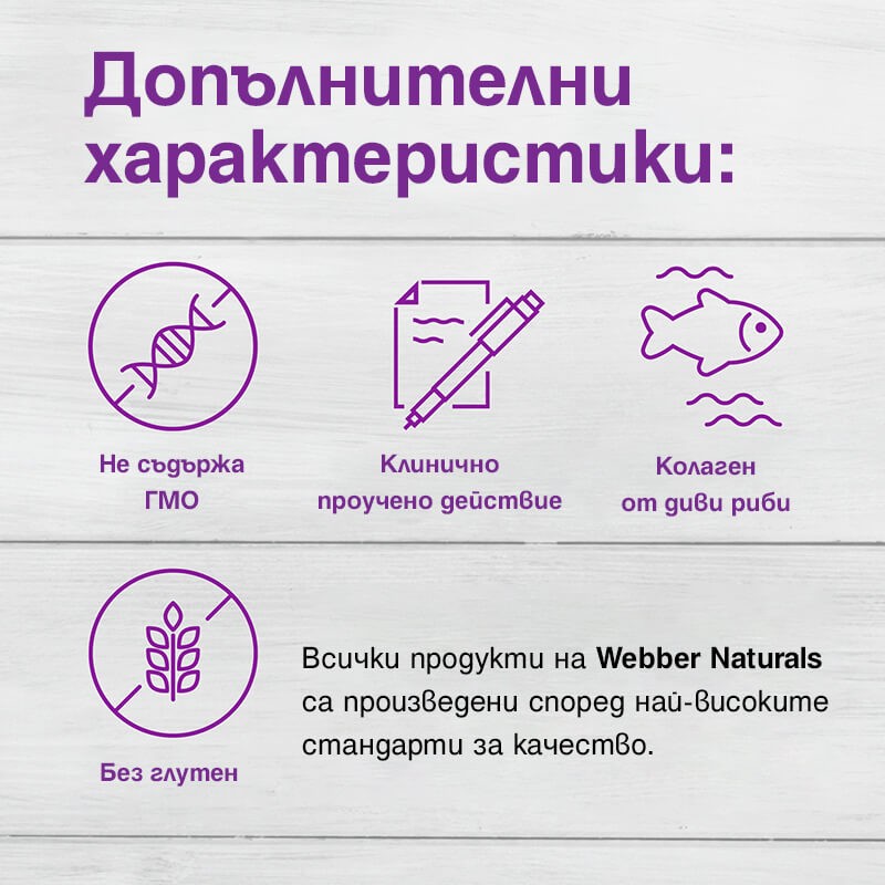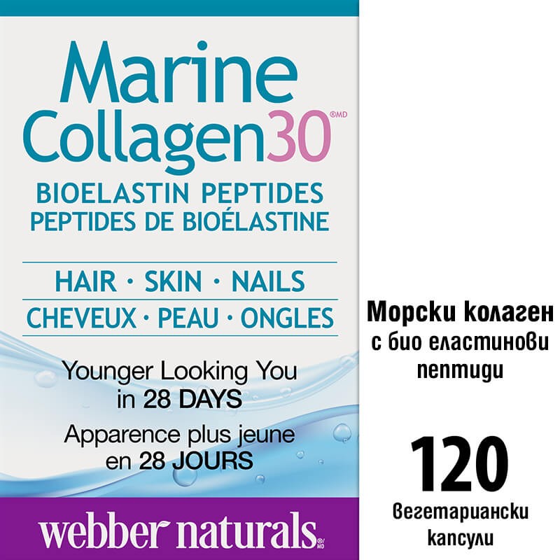 Marine Collagen30 Bioelastin peptides от Webber Naturals е източник на колаген от 100% морски произход, за който е клинично доказано, че намалява броя на дълбоките бръчки за 28 дни. Той комбинира хидролизиран колаген тип I с олигопептиди на еластин в същото съотношение, което се намира в човешката кожа за синергична активност против бръчки.