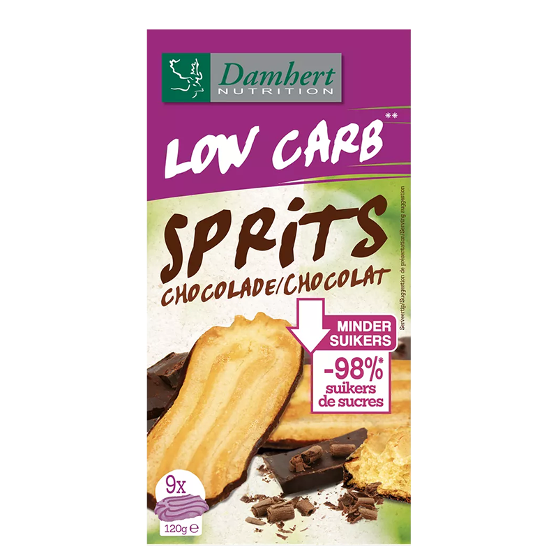 Damhert Low Carb Sprits Chocolade са неустоимо вкусни златистожълти маслени бисквитки със слой шоколад, част от серията нисковъглехидратни продукти на компанията.