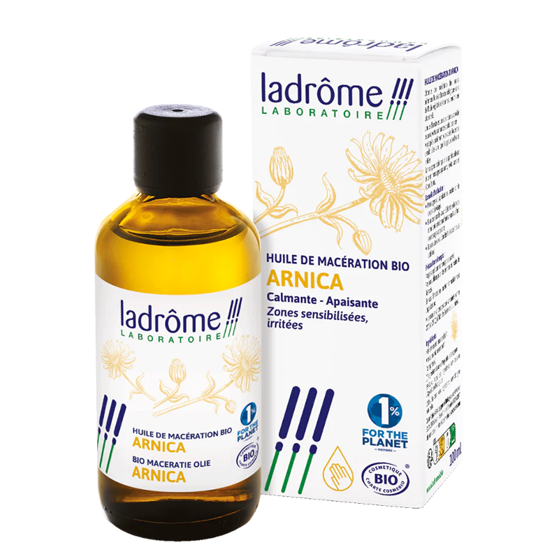 Huile d’Arnica BIO на френската компания Ladrome Laboratoire се базира на маслен мацерат от Арника от контролирано био земеделие и токофероли (витамин E).
