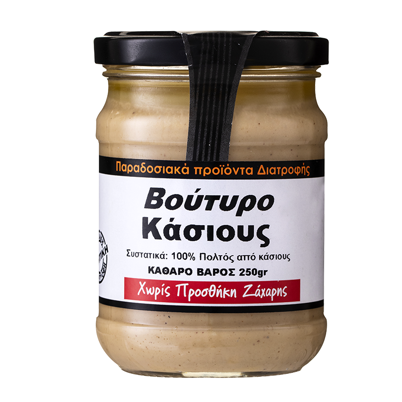 Маслото от кашу Βούτυρο κάσιους е вкусно натурално растително масло, направено от 100 % ядки от кашу. То е отличен източник на протеини, въглехидрати, здравословни мазнини, полезни фибри, антиоксиданти, витамини и минерали. Ако досега сте започвали деня си с филийка фъстъчено масло, спокойно може да го замените с масло от кашу и да забравите за множеството алергени във фъстъците.