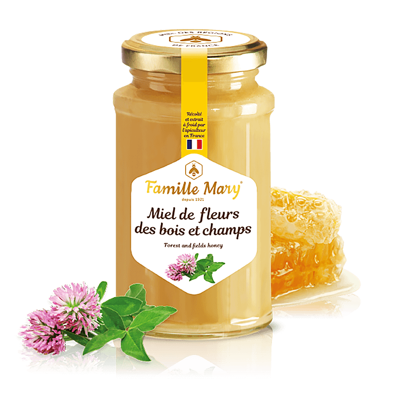 Именно сред най-дъхавите цветя и билки на френските гори и поля са разположени кошерите на семейната компания Famille Mary®, която ни поднася едно истинско гастрономическо удоволствие – Miel de fleurs des bois et champs/ Пчелен мед букет от полски и горски цветя и билки.