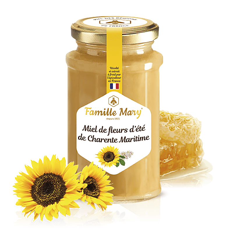 Miel de fleurs d’ete/ Пчелен мед от летни цветя се произвежда от нектара, който пчелите събират от прашеца на цветята по полетата и ливадите на областта Шарант-Маритим, Франция. Зад качеството на продукта застава Famille Mary® – френска семейна компания с история от 1921 г., която започва с…дядовата мелница в сърцето на регион Анжу в долината на Лоара. С днешна дата фамилната памет е съхранена чрез медоносната къща Beau-Rivage, където Famille Mary произвежда и предлага богат избор от мед и природни продукти, а качеството им е гарантирано със стриктен лабораторен анализ и контрол.