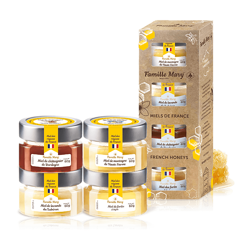 Ако обичате мед и мечтаете да се насладите на пъстра палитра от вкусове, френската медоносна къща Famille Mary® ви предлага своята селекция от четири избрани продукти Miels De France. Тя ще докосне сетивата не само на ценителите на различни флорални аромати от специфични географски региони, но и ще донесе безспорни ползи за здравето на тези, които са убедени в абсолютната сила на апитерапията (лечение с пчелни продукти).