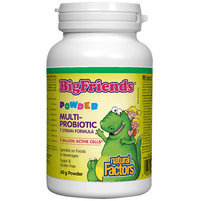 Multi-Probiotic Powder Big Friends® е висококачествен пробиотик за деца от 1 до 12-годишна възраст. Съдържа 3 милиарда активни пробиотици (лактобацили и бифидобактерии) от 7 специално култивирани пробиотични щама.