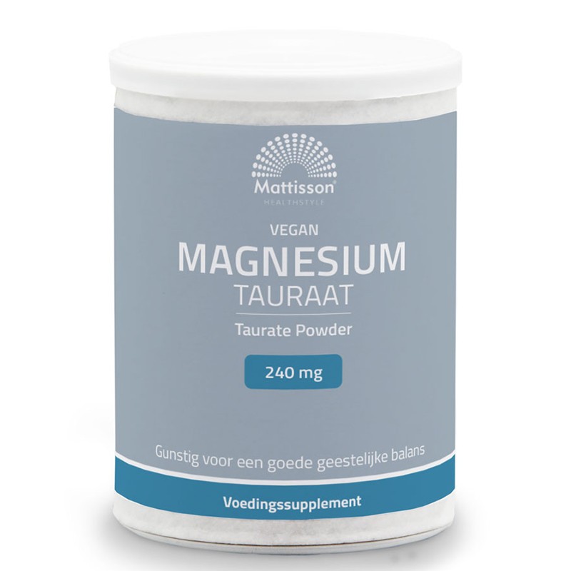 Магнезиевият таурат е молекула, образувана от реакцията на магнезиев оксид с аминокиселината таурин. Тази свързана форма на магнезий има висока бионаличност и се абсорбира по-лесно от неорганично свързания магнезий. Ежедневната диета съдържа предимно неорганично свързан магнезий, тъй като това са формите, които се срещат в почвата и се абсорбират от растенията, които се използват за храна. Дневната доза от 3 грама от този продукт на прах съдържа 3000 mg магнезиев таурат, осигуряващ 240 mg елементарен магнезий и 2760 mg таурин. Магнезиевият таурат се грижи за здравето с полезните свойства, както на магнезия, така и на таурина. Това съединение улеснява преминаването на магнезия през кръвно-мозъчната бариера и абсорбирането му в мозъка. Подобрява когнитивната функция, намалява мигрената, облекчава депресията и намалява риска от сърдечно-съдови заболявания. Продуктът е 100% веган.