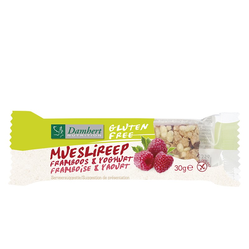 Mueslireep Framboos & Yoghurt Damhert Nutrition е безглутенов мюсли бар с пристрастяващ малинов вкус и високо съдържание на фибри. Неговата рецепта се базира на многозърнести люспи от ориз и царевица, плодове и йогурт, богати на полезни мазнини, бавни въглехидрати, аминокиселини, витамини и минерали. Здравословна закуска, която подпомага храносмилането и зарежда тялото с енергия и настроение.