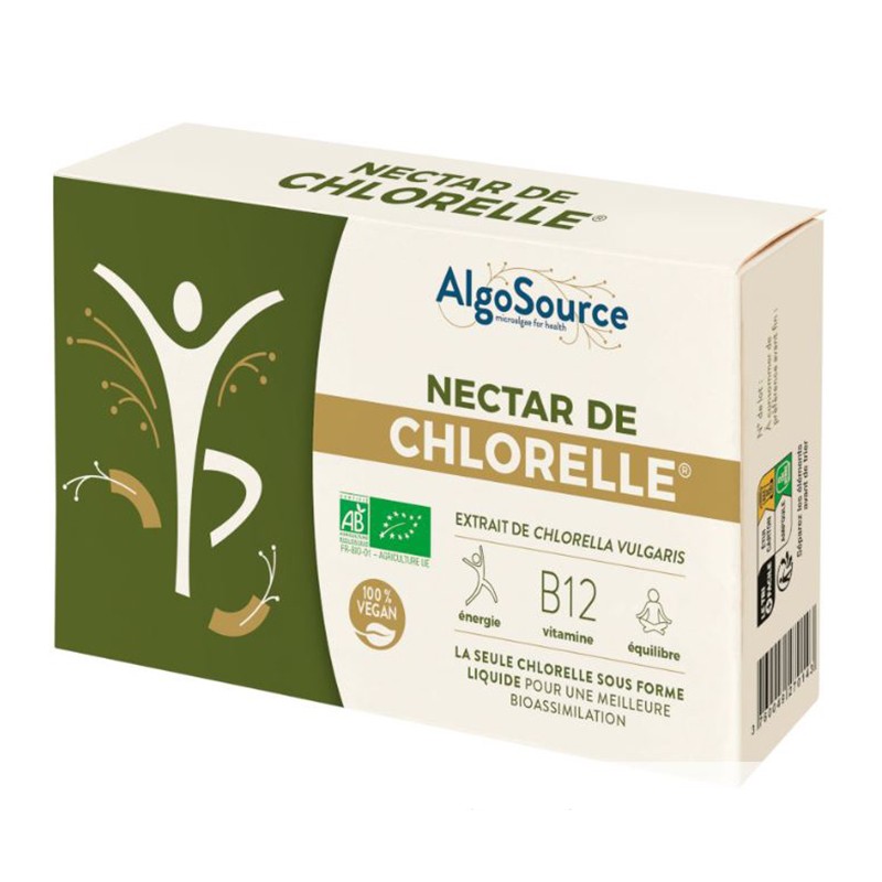 Нектарът от хлорела на френската компания AlgoSource, е 100% натурален, течен екстракт от микроводораслите Chlorella vulgaris, осигуряващ витамин В12. Хлорела нектарът има детоксикиращи, имуноукрепващи, кардиопротективни и холестеролопонижаващи свойства. Заради ободряващи си ефект, може да се използва като средство за възстановяване на жизнените сили при умствена и физическа преумора. Отлично допълнение към диетата при веганство и вегетарианство.