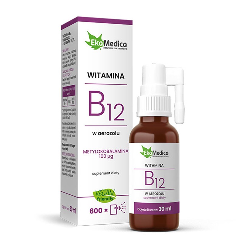 Спреят Витамин В12 на ЕкаМедика помага за правилното функциониране на имунната и нервната системи, за производството на червени кръвни клетки, за намаляване на умората и за поддържането на енергийния метаболизъм. Витамин B 12 (метилкобаламин) е от съществено значение за повече от 100 телесни функции, включително за производството на храносмилателни ензими и транспортирането на основни хранителни вещества в клетките и извън тях.
