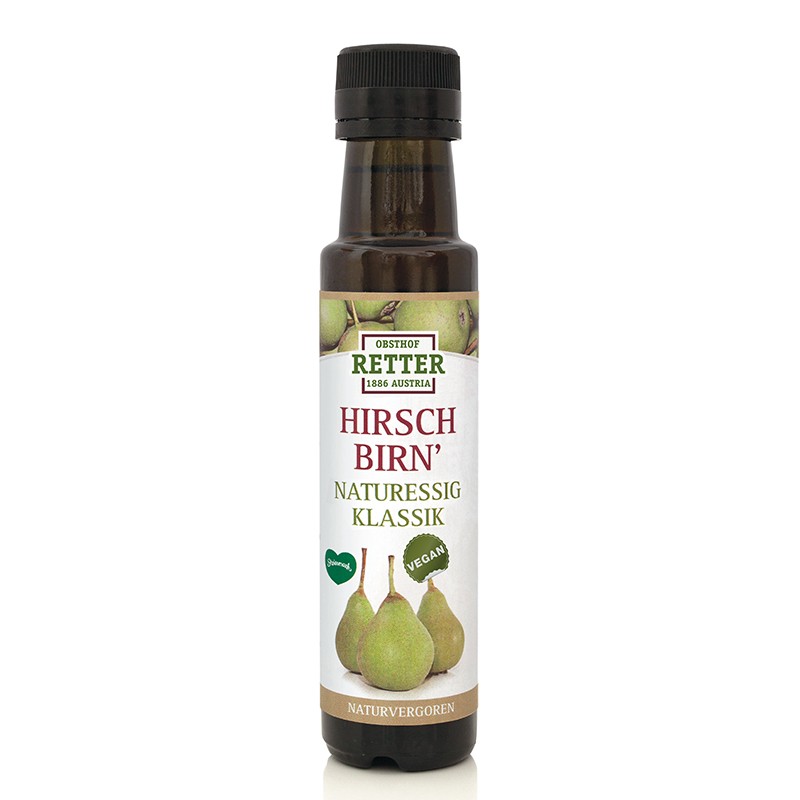 Hirschbirn Naturessig – Отлежал оцет от круши БИО (5%) е 100 % удоволствие за сетивата – неговият сладко-кисел вкус очарова с нотка на карамел и всички нюанси на аромата на типичния австрийски сорт круши Hirschbirne