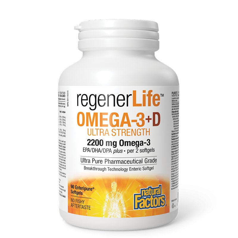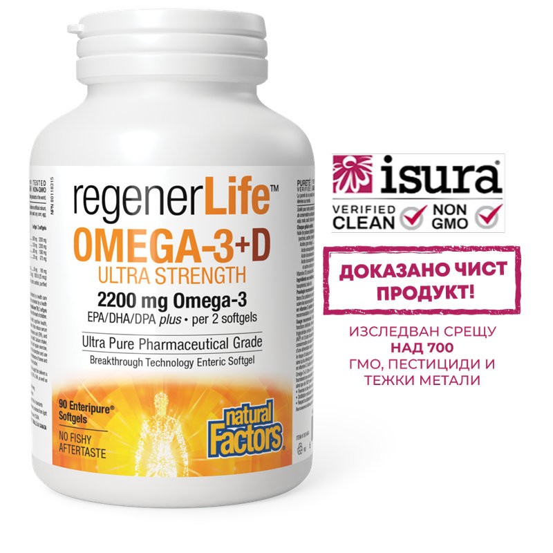 Въпреки всички известни ползи за здравето на дълговерижните омега-3 мастни кеселини, повечето възрастни хора не получават достатъчно от тях с храната си, като може и да се притесняват да консумират риба, потенциално замърсена с тежки метали. Regener Life Omega-3+D Ultra Strength осигурява молекулярно дестилирана, ултра-пречистена омега-3, проверена от ISURA® за чистота и безопасност. Това е идеално рибено масло за всеки, който иска да поддържа здравословно стареене. Тази изключително чиста, силно концентрирана формула на омега-3 плюс витамин D3 е част от линията продукти против стареене Regener Life, създадени за здраве и дълголетие.