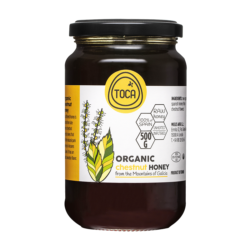 Organic Chestnut Honey – Био мед от цвят на кестен е мед за ценители. Произвежда се по специална методика и под изключителен контрол на качеството. Пчелините са разположени в защитени високопланински местности в Област Галисия, Испания – в този район почвите са необработени с торове и химикали, а въздухът е чист.