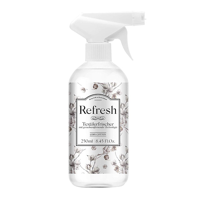 Refresh Cosy Cotton е натурален текстилен освежител, който бързо и лесно придава деликатна свежест и елиминира неприятните миризми от трудни за почистване тъкани като пердета, килими, тапицерии.