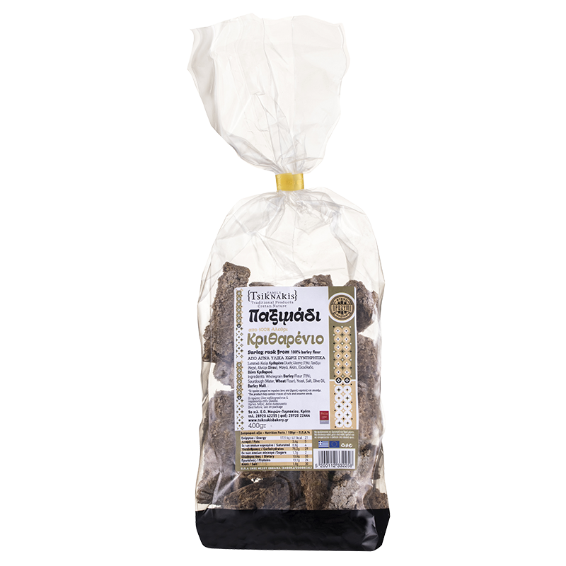 Пълнозърнести сухари от ечемично брашно съдържат пълнозърнесто ечемичено брашно и малко пшенично брашно тип 700, като тази комбинация осигурява оптимален баланс на основните хранителни вещества – протеини, мазнини и въглехидрати. Те са произведени по традиционна рецепта от остров Крит от фамилната печарна Tsiknаkis и са здравословна храна с максимални ползи за организма.
