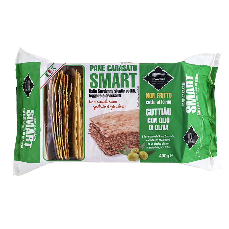 Pane Carasatu Guttiau е от линията Smart на пекарната Battacone от остров Сардиния. Той е популярен и обичан вариант на хляба Pane Carasatu, но в него има добавен превъзходен местен зехтин и поръска от сол. С фина текстура, наричан „сардински крекер“, той e неустоимо апетитен. Рецептата му се предава от поколения, от времето, когато овчарите на острова са изпращани далеч от дома си с торби сух Pane Carasatu, за да задоволят глада си от полезна и засищаща храна, докато пасат стадата по хълмовете. Тази традиция не е прекъсната и до днес, а Pane Carasatu е един от символите на кухнята на Сардиния.