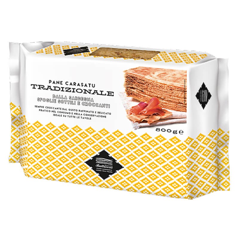 Pane Carasatu Tradizionale – традиционният плосък, тънък хляб от остров Сардиния, е перфектното решение. Разчупете една голяма кора от него на дребни парчета и се насладете на пълната му хармония с различни топинги. Той е двойно препечен и веднага ще разберете защо италианците го наричат carta da musica – толкова е хрупкав, че създава „музикален“ шум при дъвчене, толкова е фин, че прилича на хартията на музикалните партитури.