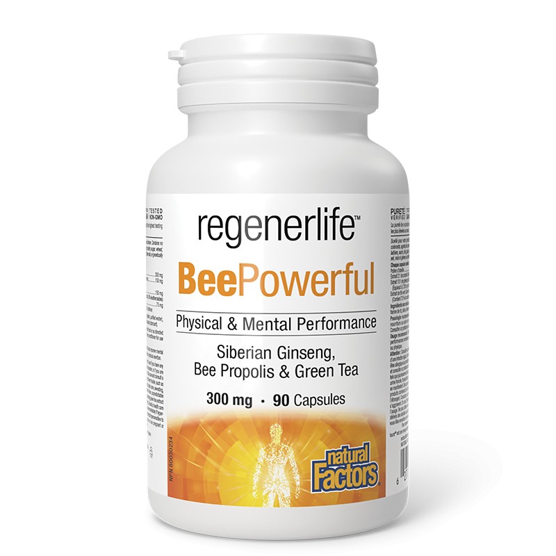 Източник на антиоксиданти за поддържане на цялостното здраве Natural Factors Regenerlife BeePowerful комбинира пчелен прашец, пчелен прополис, сибирски женшен и зелен чай. Препоръчва се за подобряване на умственото и физическото представяне след периоди на натоварване или за по-бързо възстановяване след боледуване.