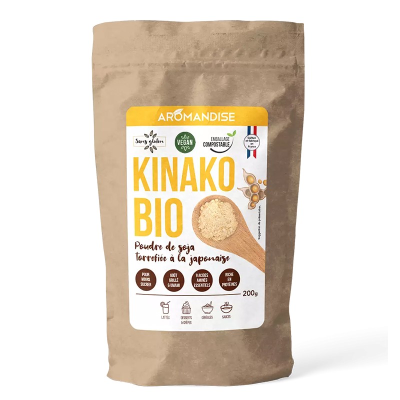 Като част от продуктовата гама на Aromandise, това Кинако на прах съдържа соя, отгледана и преработена във Франция и опакована в торбичка за компостиране. Смлените печени соеви зърна имат широка гама на приложение. Могат да се използват за топинги, за сгъстяване на сосове, за добавяне към всякакви ястия и десерти, като им придават лек умами вкус, наподобяващ този на фъстъците и лешниците. Продуктът се поръсва като пудра захар и се интегрира без усилие върху или вътре в сладкишите. Подходящ е за салати и основни горещи ястия, за влагане в теста за торти и бисквити, за добавяне към кисело мляко, сладолед, шоколад, горещо мляко, смути и др. Благодарение на богатството си на сладки на вкус аминокиселини, Кинако има собствена подслаждаща сила и позволява да се намали употребата на захар. Печената соя на прах е от органично земеделие и е изцяло веган продукт.