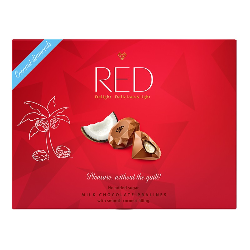 Сладостта им се дължи на естествените подсладители еритритол и малтитол, които са с нисък гликемичен индекс и минимално съдържание на калории. Пралините са подходящи за диабетици и за всички, които държат на здравословното хранене. В състава им присъстват само натурални съставки от контролирано био земеделие и животновъдство. Без ГМО, без заместители на какаовото масло, глутен, фруктоза и консерванти. Пралините на RED са с 30% намалени калории, благодарение на използването на по-малко мазнини в сравнение с обикновените пралини от млечен шоколад със сметанов пълнеж. Този вкусен шоколад с кокосов крем е създаден от най-добрите шоколатиери от Франция и Швейцария. Уникалната диамантена форма на пралините засилва удоволствието и насладата за сетивата.