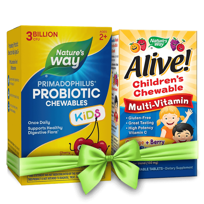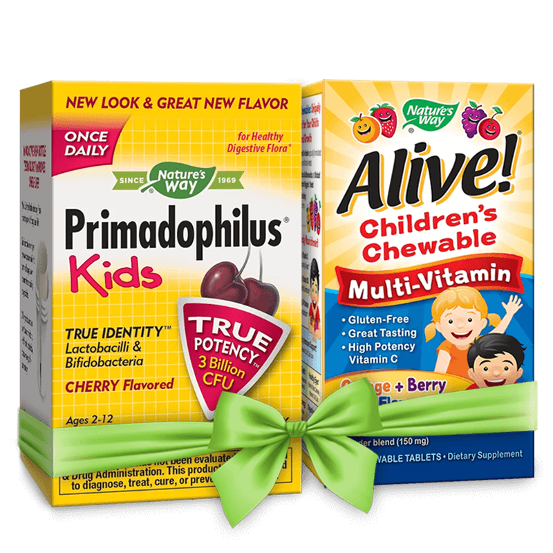 Поръчайте мултивитамини Alive! Children’s Chewable в комплект с един от двата вида пробиотици Primadophilus Kids (с вкус на череша) на преференциална цена сега!