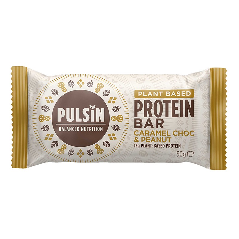Съдържа комбинация от грахов и оризов протеин, необходимите на тялото незаменими аминокиселини, витамини и минерали. Растителният карамелен шоколадов бар с фъстъци осигурява енергия преди или след тренировка. Продуктът не съдържа захар. Подсладен е с полезния за зъбите ксилитол, естествено срещащ се в кората на брезовото дърво, както и в много плодове и зеленчуци. Съдържанието на протеини и фибри във вкусното блокче засища за дълго и поддържа физическата енергия между основните хранения. Цялата серия протеинови барове на Pulsin е на растителна основа и е направена с премиум естествени съставки със страхотен вкус. Суровините са от контролирано био земеделие. За запазване на полезните вещества на съставките, протеиновите барове са студено пресовани. Този протеинов бар съдържа минимално количество мазнини и изключително много фибри от цикория за подпомагане на храносмилателния процес. Продуктът е допълнително обогатен с минерали и витамини.