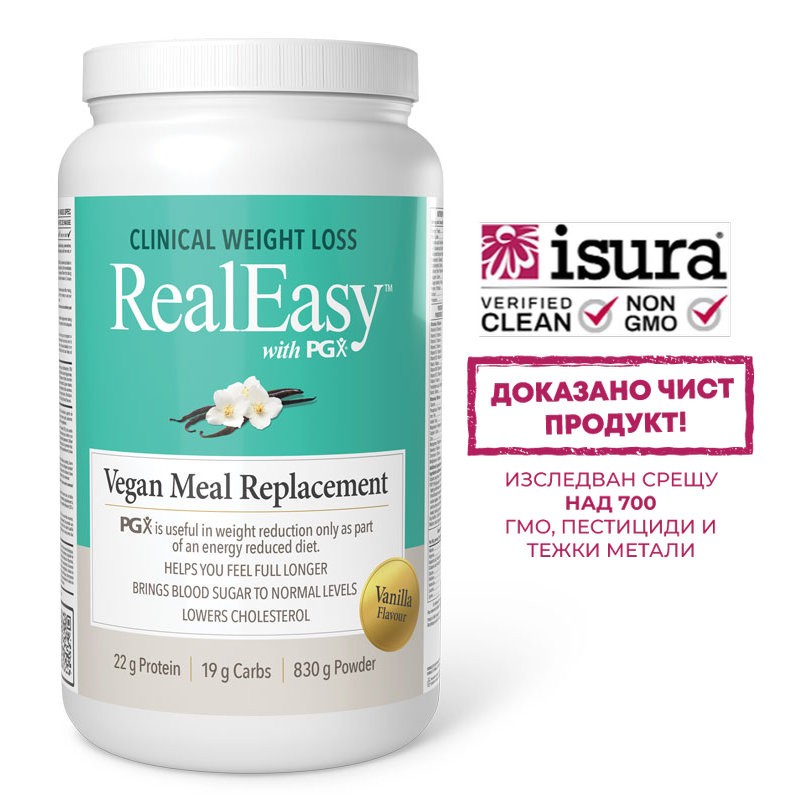 Real Easy™ with PGX® Vegan Meal  Replacement Vanilla Flavour от Natural Factors е безопасен и ефективен заместител на хранене за постигане на трайна загуба на тегло.