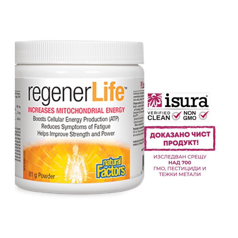 Rеgener Life е високоспециализирана, бързодействаща енергизираща бленда за защита срещу преждевременно стареене и възстановяване на жизнените сили при изтощение, тежък стрес, физическо или умствено претоварване. Приемът на Rеgener Life спомага за стимулиране производството на аденозинтрифосфат / АТФ – (макроергично съединение, осигуряващо енергия за клетките) и увеличаване на нивата му в клетките и тъканите.
