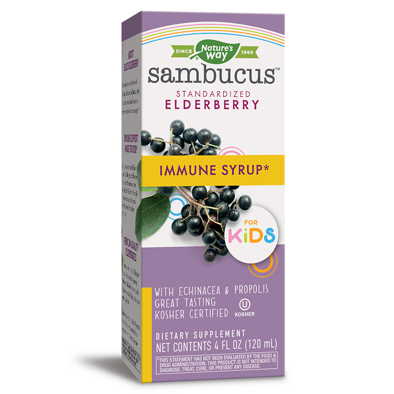 Висококачествен детски имуностимулатор с активна съставка екстракт от черен бъз – растение, чиито общоукрепващи свойства са известни от векове насам. Сиропът е част от специалната продуктова серия на Nature’s Way – Sambucus, формулирана с единствен по рода си сорт черен бъз, богат на антиоксидантни съединения.