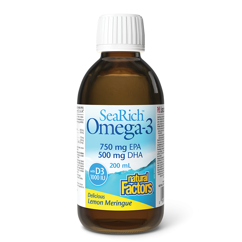 Хранителната добавка SeaRich™ Omega -3 на марката Natural Factors представлява омега-3 формула със страхотен вкус, произведена от свежо рибено масло с най-високо качество, която поддържа когнитивните функции и здравето на сърдечно-съдовата система. Тя съдържа две от трите биоактивни при хората омега-3 мастни киселини – докозахексаеновата (DHA) и ейкозапентаеновата (ЕРА) под формата на триглицериди, която се отличава с по-висока биоактивност и отсъствие на рибен послевкус, заедно с ключовия за имунната функция витамин D3.