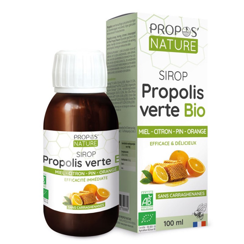 Sirop Propolis verte Bio – Сироп с екстракт от прополис, пчелен мед и етерични масла от морски бор, лимони портокал е изцяло натурална хранителна добавка в течна форма и естествени съставки със силно изразени антибактериални, противовъзпалителни и противовирусни свойства