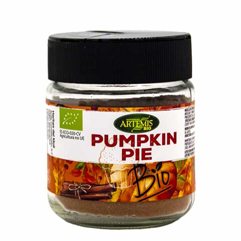 Pumpkin Pie BIO – БИО Смес от подправки е изцяло натурален продукт, смес от 5 вида подправки – канела (25%), индийско орехче, кардамон, детелина и джинджифил. Тази смес е подходяща за влагане в различни печива, сладкиши и напитки и придава неустоим аромат и вкус. Освен страхотните си вкусови качества, тя притежава и редица полезни свойства за организма. Екстрактът от канела в тази смес има антимикробно действие и спомага за облекчаване на симптоми като раздразнен стомах. Джинджифилът притежава много силно антисептично и имуностимулиращо действие. Защитава организма и спомага за укрепване на имунната система. Индийското орехче има високо съдържание на фибри, както и множество полезни вещества като мед и манган. Кардамонът съдържа калий, калций, желязо и фосфор и подобрява храносмилането и насърчава детоксикацията. Детелината има противоалергично действие и защитава организма и клетките в тялото.
