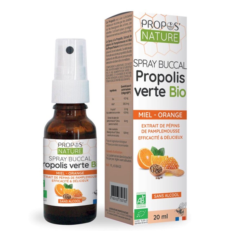 Спреят за гърло на Propos Nature с органичен зелен прополис, мед, грейпфрут, сладък портокал и мента допринася за нормалното състояния на горните дихателни пътища и гърлото, като осигурява бързо и дълготрайно усещане за благополучие