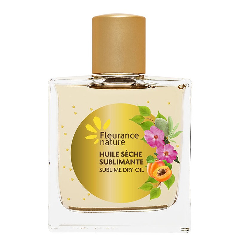 Huile sèche sublimante – Сухо сублимиращо масло е козметичен продукт, който съдържа в състава си фина комбинация от 4 растителни масла от контролирано био земеделие – масла от сусам, роза, сладък бадем и ядки от кайсия