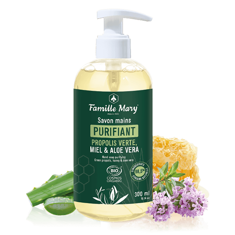 Пчелният мед и прополисът в течния сапун са 100% натурални. Те идват от кошерите на френската семейна компания Famille Mary, която има над 100 години опит и традиции в производството на качествени БИО пчелни продукти.
