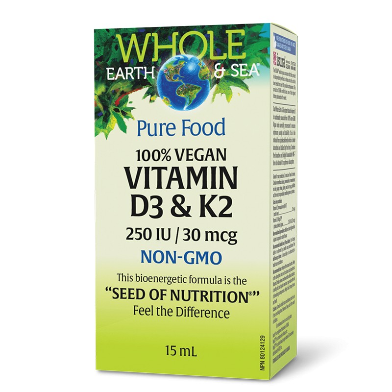 Whole Earth & Sea 100% Vegan Vitamin D3 & K2 от Natural Factors е растителен източник на тези основни витамини , разработен специално за вегани и вегетарианци. Комбинира лесно усвоимата форма на холекалциферол на витамин D3, устойчиво получена от 100% водорасли, без ГМО с биологично активната форма MK-7 на витамин K2, естествено произхождаща от зърна нато. Течните капки са лесни за приемане и предлагат подкрепа с двойно действие за здрави кости и здрава имунна система.