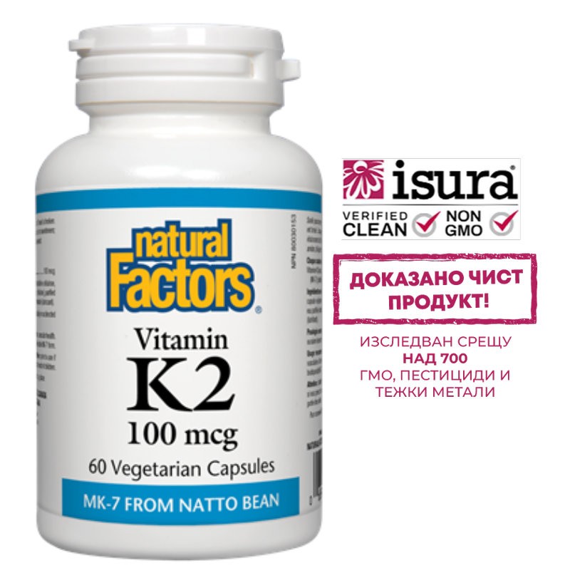 Надеждна грижа за костите и сърдечносъдовата система с най-бионаличната форма на витамин К2 – менахинон-7 (МК-7)! К2 в продукта на Natural Factors е иззет от семена на ферментирала соя и е получен в хода на ферментацията на соевите зърна по традиционната японска рецепта за натто. Натто е високо ценено в японската кухня ястие, подобно на миризливо сирене. То е най-богатият природен източник  на витамин К. Докато натто рядко се счита за приятна храна от повечето европейци, MK-7 е без мирис и има 100% витаминна активност.