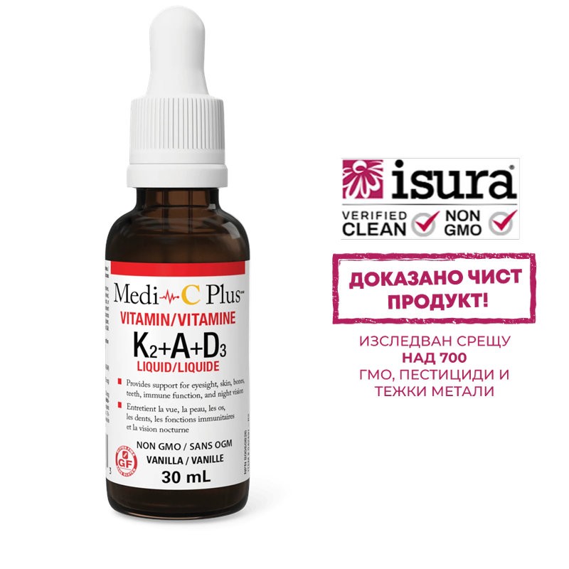 Витамин К2+ А+ D3 е под формата на течната субстанция, лесна за прием, гарантираща бързо усвояване и отлична абсорбция от тялото.