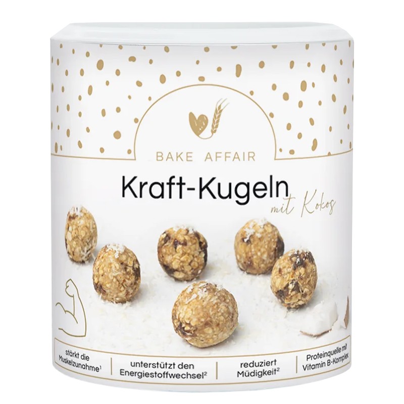 Bake Affair Витаминна смес с кокос Веган енергийни топки, 202 g предоставя на тялото пълната гама от В витамините – В1, В2, В3, В5, В6, В9 и В12 – в прекрасна рецепта за десерт за всяка възраст и хранителен режим. Продуктът съдържа перфектно подбрани сертифицирани като органик компоненти, които са подходящи при веган диета, както и по време на бременност и кърмене. Той съдържа в перфектно съотношение само няколко прости, но полезни и внимателно оглеждани ресурси: качествено оризово брашно вместо висококалорична бяла пшеница, фурми за подслаждане, люспи от овес и кокос за плътен аромат и наситен вкус, както и първокласен суроватъчен протеин за трениращите и търсещите сила и тонус в средата на деня.