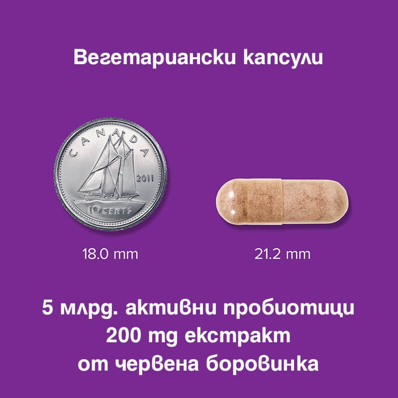 Всяка капсула гарантирано съдържа 5 милиарда колония-образуващи единици (CFU) до изтичане срока на годност на продукта – лактобацили и бифидобактерии, както и 200 mg мощен концентрат от червена боровинка.