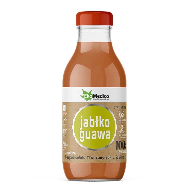 EkaMedica 100% сок от ябълка и гуава e директно пресован ябълков сок (80%), с добавено пюре от гуава (20%), обогатен с витамин С