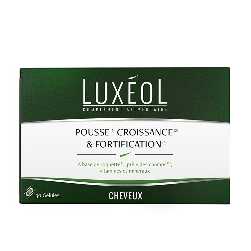 Luxéol  За Растеж и Укрепване на косата е хранителна добавка под формата на капсули, съдържаща съставки с естествен произход (екстракт от рукола, полски хвощ, биотин, мед, селен, цинк, витамин B6) в подкрепа нормалното състояние на косата. Екстрактът от рукола в този продукт помага за стимулиране на космения фоликул и по този начин насърчава растежа на косата. Екстрактът от полски хвощ също помага за стимулиране растежа на косата, а освен това укрепва косата и подобрява нейното състояние, гладкост и мекота. Цинкът, селенът и биотинът се грижат за доброто състояние на косата и спомагат за поддържане на нейната здравина и еластичност. Микроелементът мед в този продукт допринася за поддържане на нормалната пигментация на косата. Хранителната добавка е подходяща за 30-дневна програма.