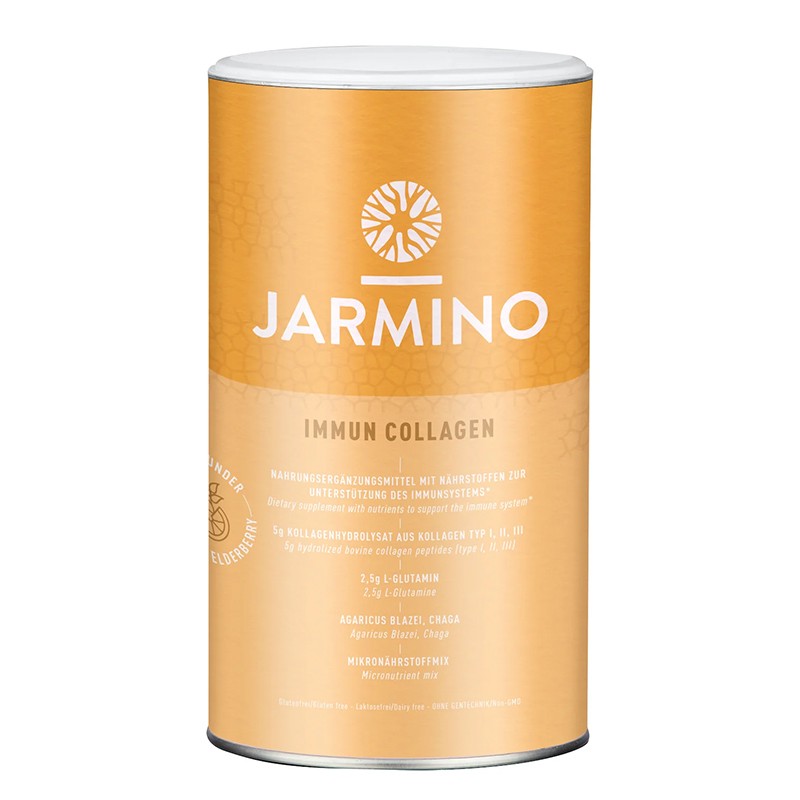 Immune Collagen Jarmino е иновативна комбинация на колаген и L-глутамин с билки, витамини и медицински гъби, специално разработена в подкрепа на имунната система. Комплексът допринася за повишаване на антиоксидантната защита и помага за намаляване на вредните ефекти на съвременния начин на живот като мръсен въздух, климатизирани помещения, небалансиран хранителен режим и др.