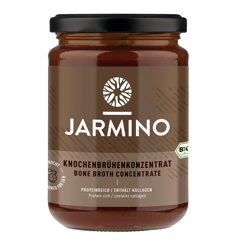 Beef bone broth concentrate на Jarmino е натурален концентрат от телешки костен бульон от пасищни животни, отглеждани в органични ферми в Бавария и Тирол. Формулата не съдържа алергени и други вредни компоненти и се състои само от три съставки – вода, бульон и каменна сол. Особено подходящ за компенсиране на липсите от колаген по време и след менопауза, за възстановяване на тялото след тренировка, по време на диета или лечебно гладуване. Продуктът помага за подобряване на хранителната стойност на ястия за възрастни и деца и може да се приема самостоятелно или овкусен с билки и подправки. Също така може да се комбинира със сокове, шейкове, чайове, сосове, кисело мляко и зърнени храни, както и за основа на любими кулинарни рецепти.