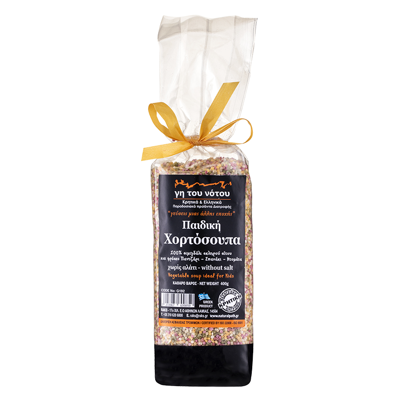 Дребната паста от пълнозърнеста пшеница Σούπα λαχανικών για παιδιά, която в превод от гръцки звучи като „зеленчукова супа“, е отлично и лесно решение за храненето на децата у дома. Тя е цветна, защото съдържа натурални екстракти от цвекло, спанак и домати, богати на витамини, минерали и антиоксиданти – толкова важни за подрастващия организъм. Тя се използва като добавка към супи – пилешка, телешка, зеленчукова, рибена, аналог на нашето фиде, но може и да я сервирате самостоятелно, сварена 5 минути във вряща вода, гарнирана с масло, сирене, пасирани зеленчуци, плодове пюре. Тъй като тази паста е приготвена от 100 % грис от твърда пшеница, тя се отличава с най-доброто качество.