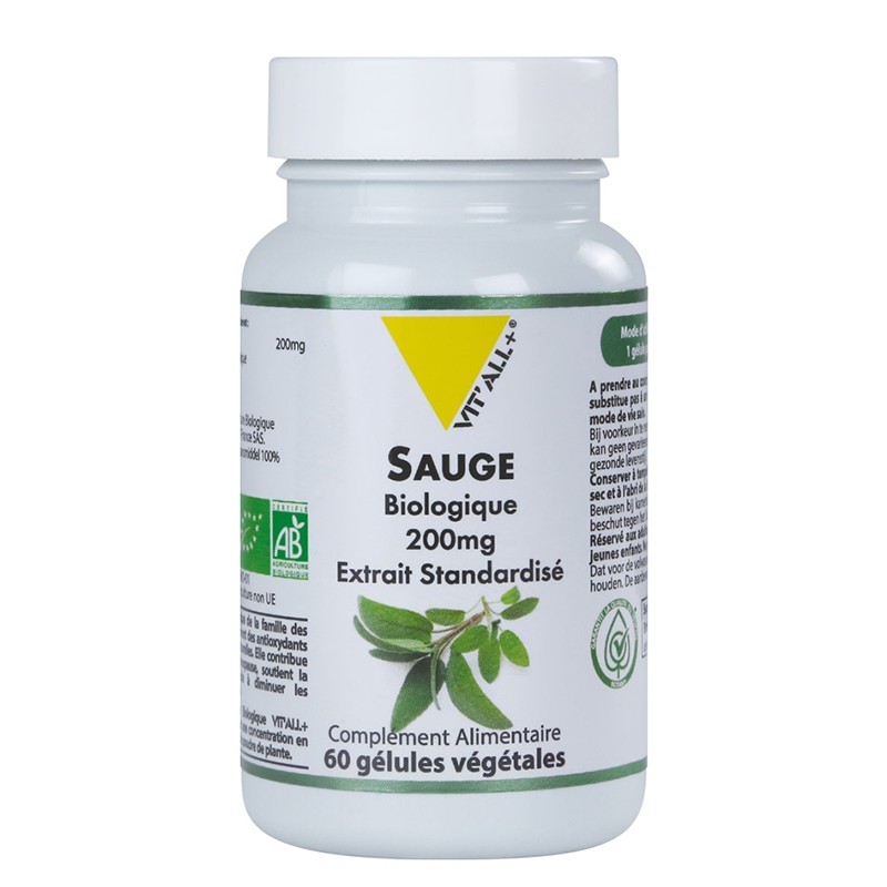 Sauge bio – Органичен екстракт от градински чай (салвия) на френската компания VIT’ALL+® е съставка от органично земеделие и съдържа стандартизиран био екстракт от градински чай 5:1, който гарантира стабилност на дозировката и оптимална чистота и концентрация на активни съставки, 5 пъти по-висока от тази на растителния прах. Продукт с изключително качество, сертифициран от ECOCERT France SAS